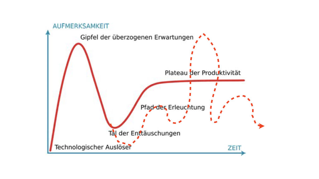 Ich vermute, dass die KI den Pfadverlauf linearer Technik-Entwicklungen sprengen wird. Sie wird zu einer Menge Enttäuschungen führen, freigelegten, „nackten“ Hypes. Aber auch zu enormen Positiv-Effekten an Stellen, wo man sie heute nicht vermutet. KI ist eine Überraschungsbox, eine Wundertüte, eine Pralinenschachtel ganz im Sinne von Forrest Gump (oder war es seine Mutter?). Eine Rollercoaster-Technologie. Man könnte aber auch sagen: Ein Dauer-Hype mit Ausschlägen in die bessere Welt.