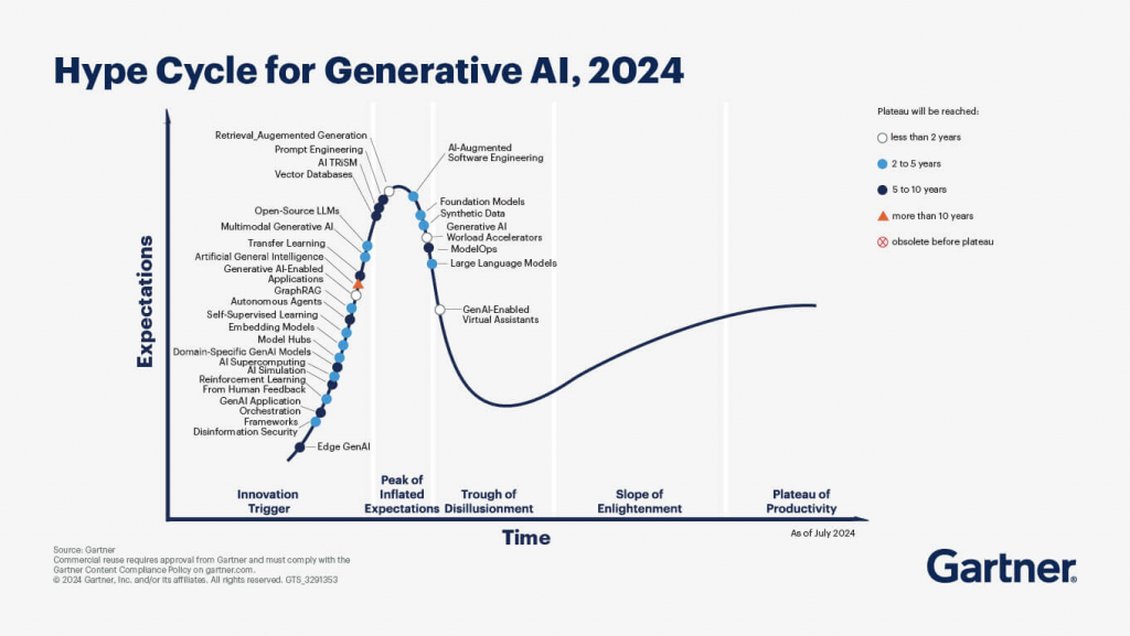 Die Gartner-Kurve, ein Analyse-Instrument der gleichnamigen Beratungsgesellschaft, gilt als das Nonplusultra der Technologie-Prognostik. Sie ist gerade in Bezug auf die KI-Entwicklung von großer Bedeutung. Die Kurve ordnet Technologien auf einer Linie von Hype-Faktor durch das „Tal der Enttäuschung“ bis hin zu den realen Anwendungsmärkten. Hier die Gartner-Kurve für KI 2024: