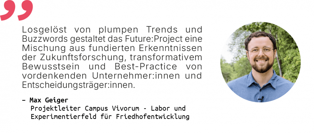 The Future:Project ist der Think Tank für die Wirtschaft von morgen. In Transformationsprojekten, Events, Seminaren, Keynotes und Publikationen erforscht, gestaltet und begleitet das Team von The Future:Project Transformationen – und arbeitet für eine lebenswerte Zukunft!